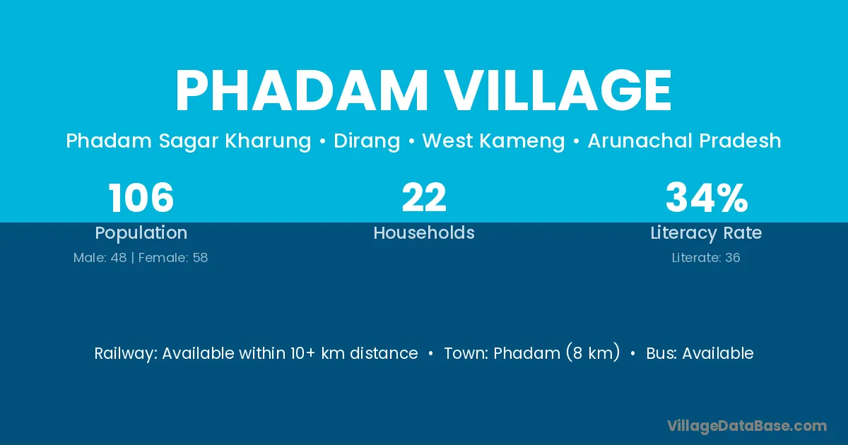 The literacy rate of Phadam Village village is 33.96%. Male literacy stands at 31.25% and female literacy at 36.21%.