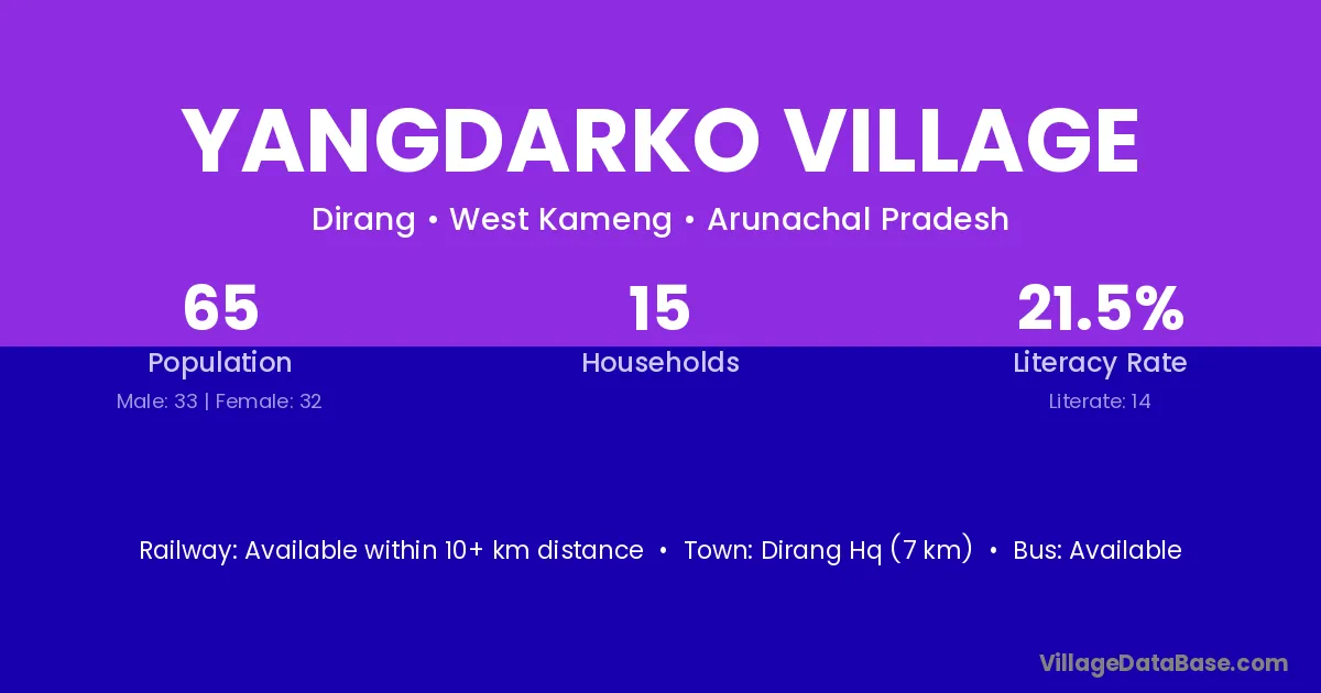 Dirang Hq (7 km) is the nearest town to Yangdarko Village village for major economic activities and is located approximately 7 km away.