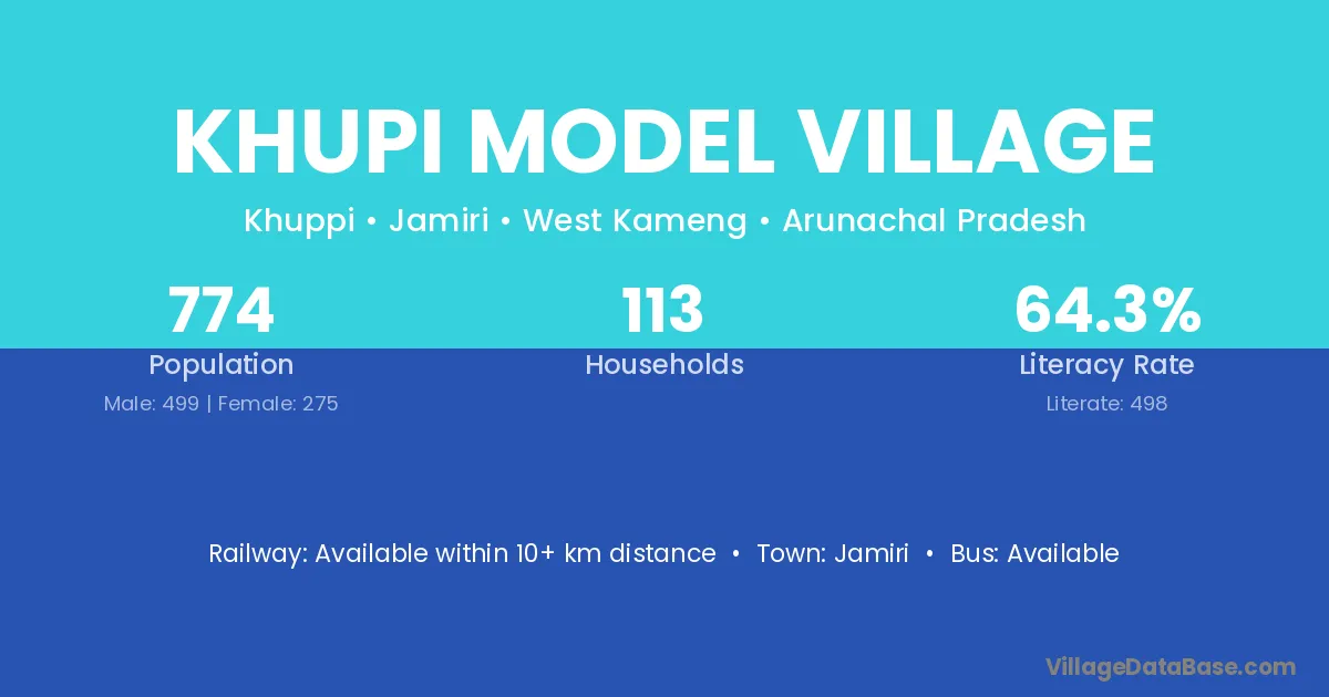 Khupi Model Village village has a total population of 774 people, of which 499 are males and 275 are females.