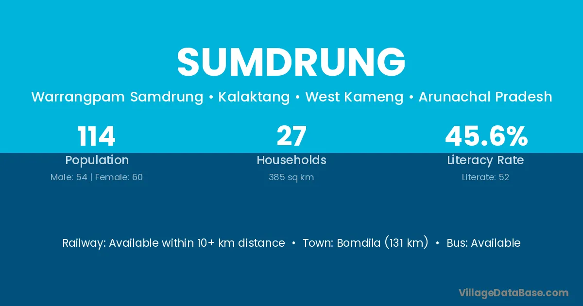 Bomdila (131 km) is the nearest town to Sumdrung village for major economic activities and is located approximately 131 km away.