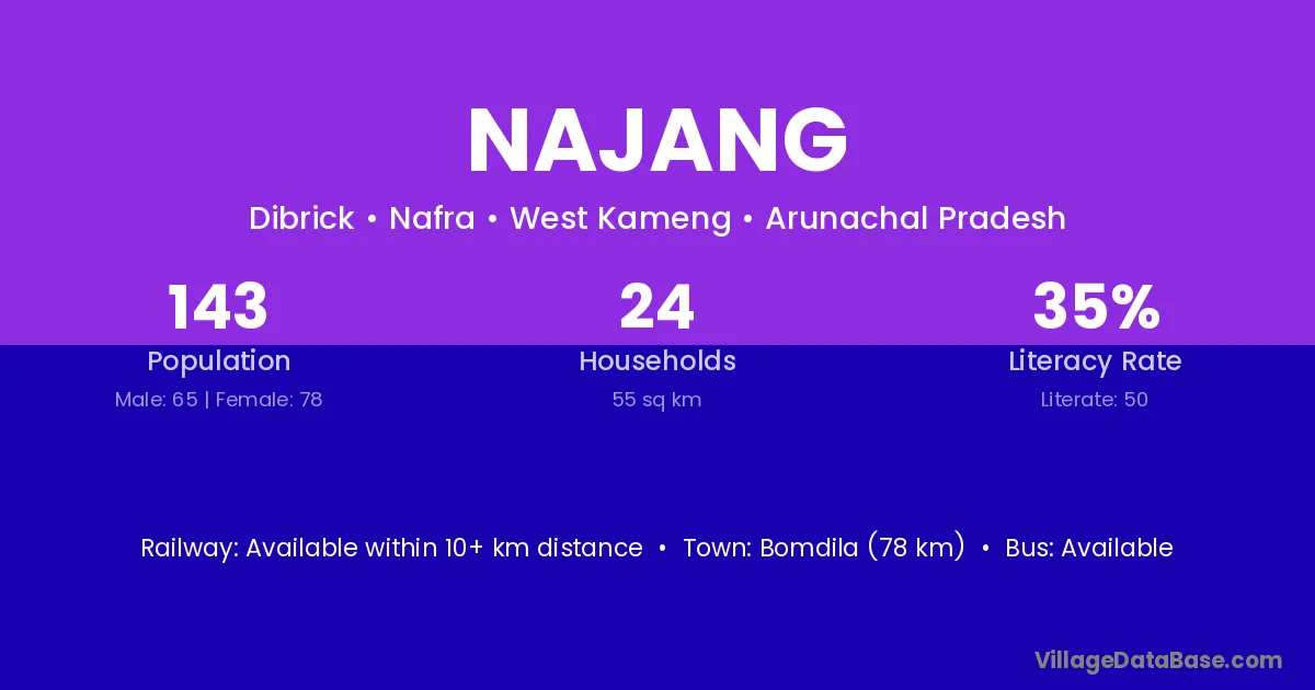 Bomdila (78 km) is the nearest town to Najang village for major economic activities and is located approximately 78 km away.
