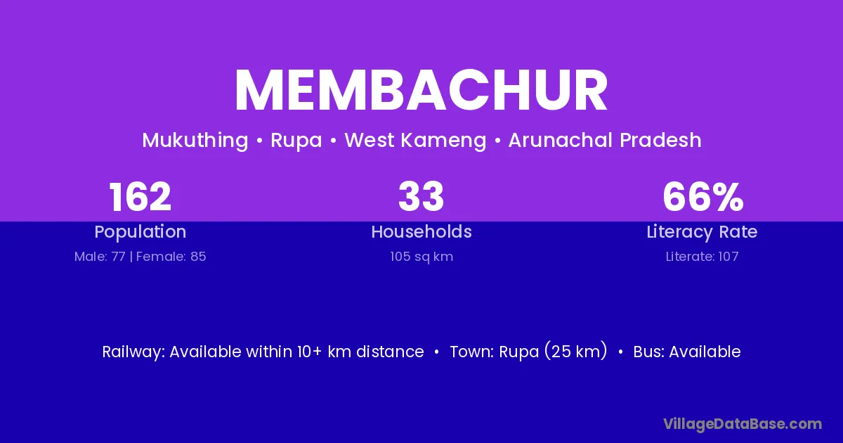 Rupa (25 km) is the nearest town to Membachur village for major economic activities and is located approximately 25 km away.
