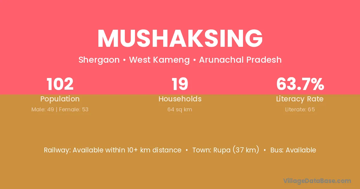 Rupa (37 km) is the nearest town to Mushaksing village for major economic activities and is located approximately 37 km away.