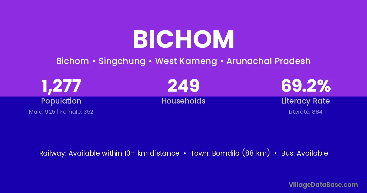 Bomdila (88 km) is the nearest town to Bichom village for major economic activities and is located approximately 88 km away.