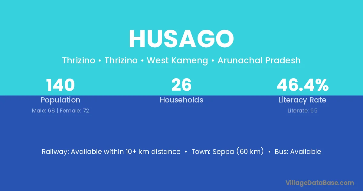Seppa (60 km) is the nearest town to Husago village for major economic activities and is located approximately 60 km away.