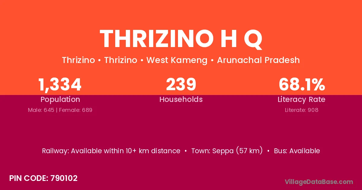Seppa (57 km) is the nearest town to Thrizino H Q village for major economic activities and is located approximately 57 km away.