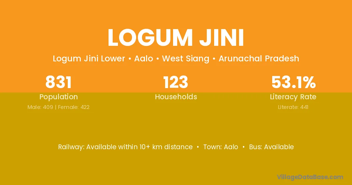 Logum Jini village has a total population of 831 people, of which 409 are males and 422 are females.