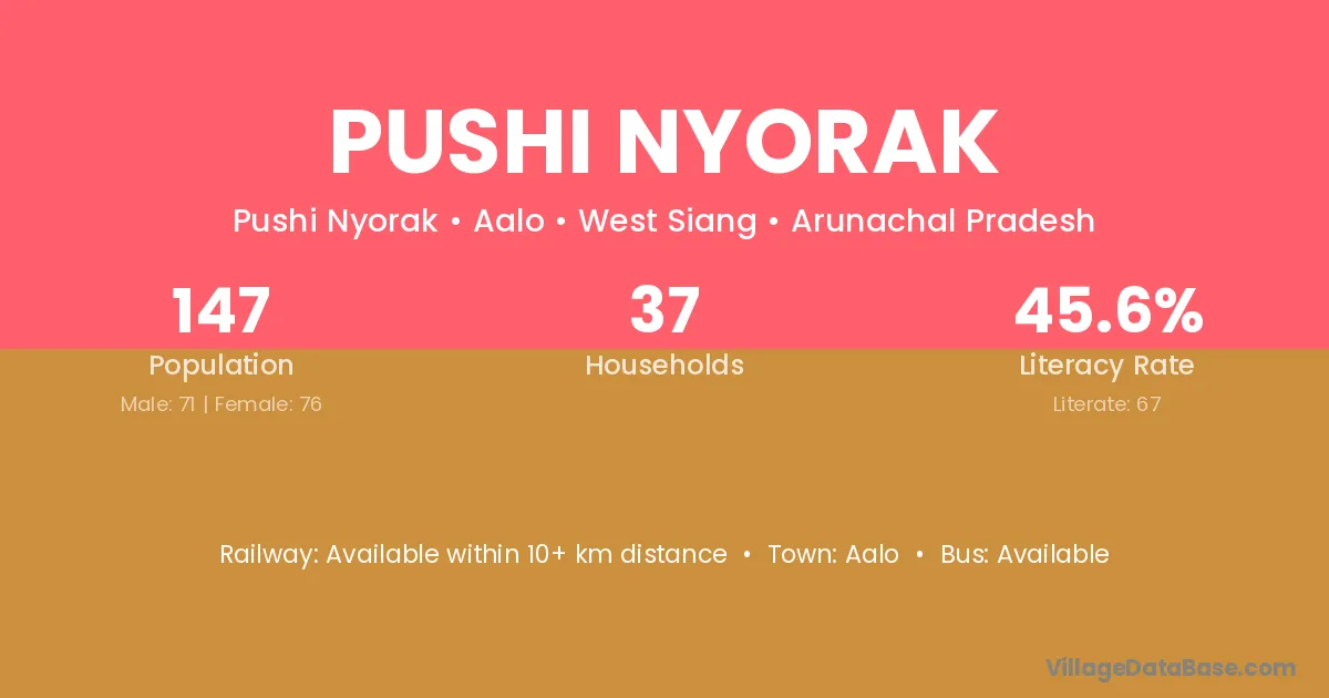 The literacy rate of Pushi Nyorak village is 45.58%. Male literacy stands at 57.75% and female literacy at 34.21%.