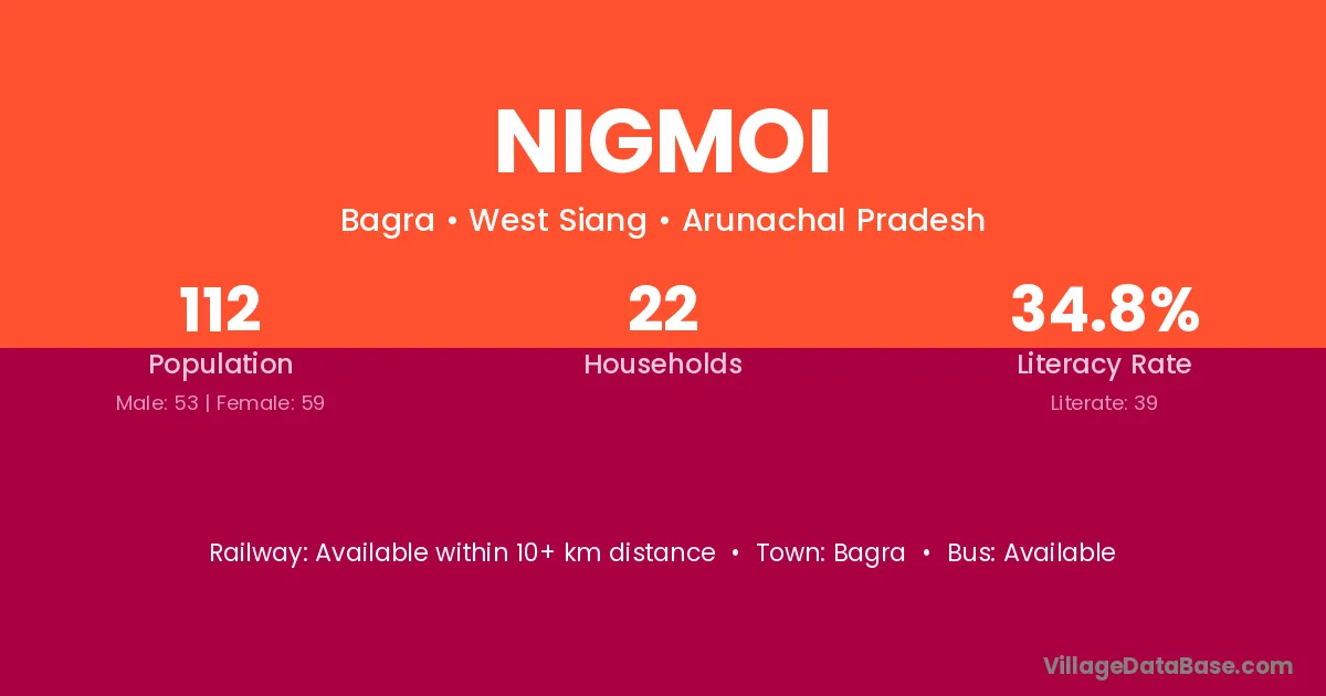 Nigmoi village has a total population of 112 people, of which 53 are males and 59 are females.