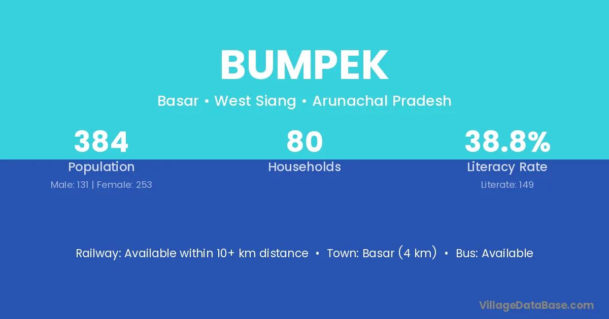 The literacy rate of Bumpek village is 38.80%. Male literacy stands at 49.62% and female literacy at 33.20%.