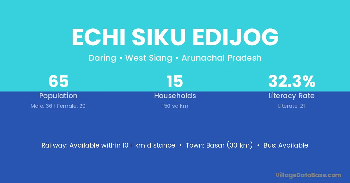 Basar (33 km) is the nearest town to Echi Siku Edijog village for major economic activities and is located approximately 33 km away.