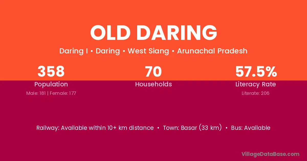 Basar (33 km) is the nearest town to Old Daring village for major economic activities and is located approximately 33 km away.