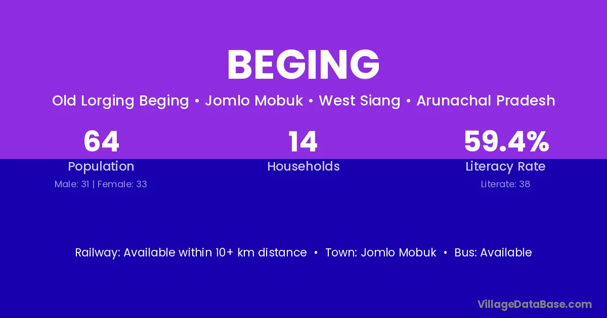 Beging village has a total population of 64 people, of which 31 are males and 33 are females.