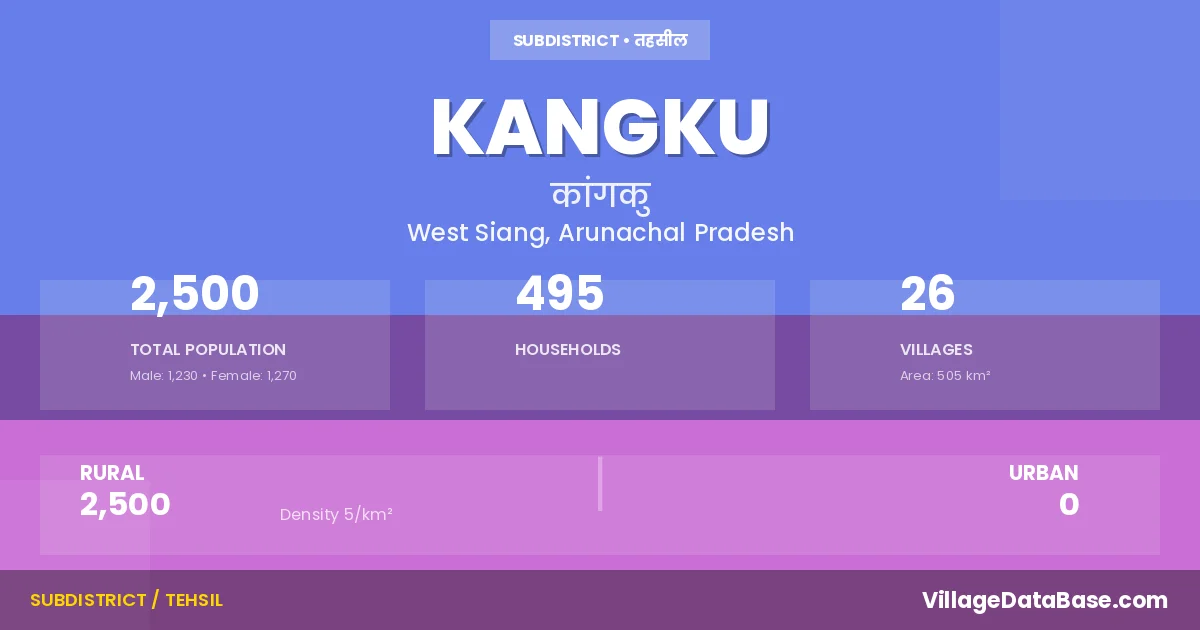 Kangku is a town and Circle in the West Siang district of the Arunachal Pradesh. In India, a Circle is a subdivision of a district responsible for the administration and revenue collection of a specific area within the district. Circles play a crucial role in the local governance structure, contributing significantly to the development and administration of their communities.