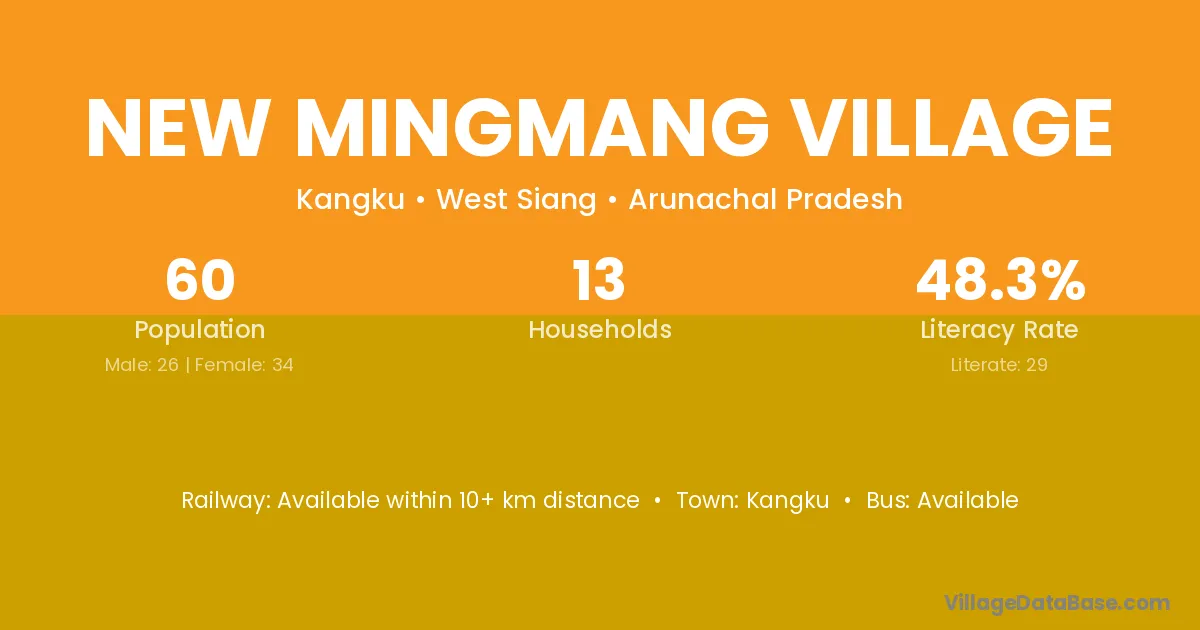 New Mingmang Village village has a total population of 60 people, of which 26 are males and 34 are females.