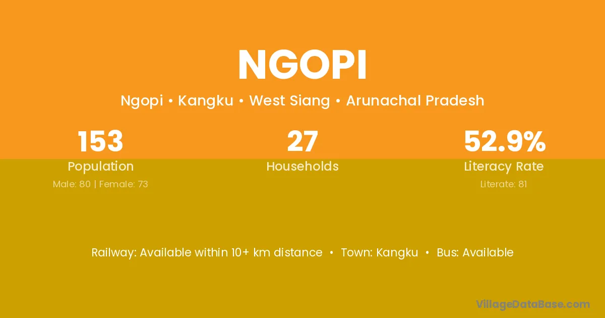 Ngopi village has a total population of 153 people, of which 80 are males and 73 are females.