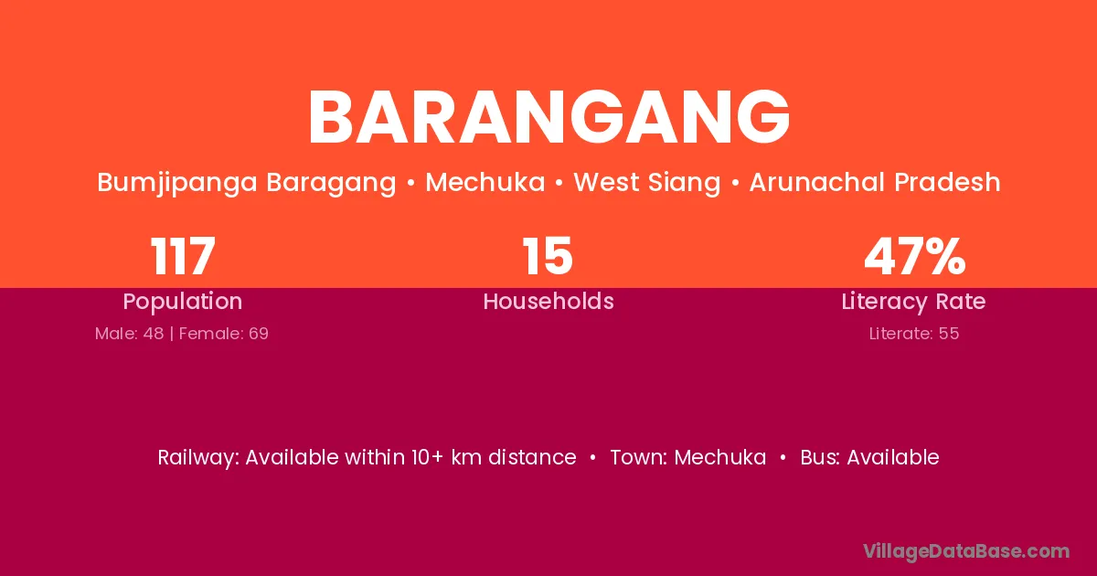 Barangang village has a total population of 117 people, of which 48 are males and 69 are females.