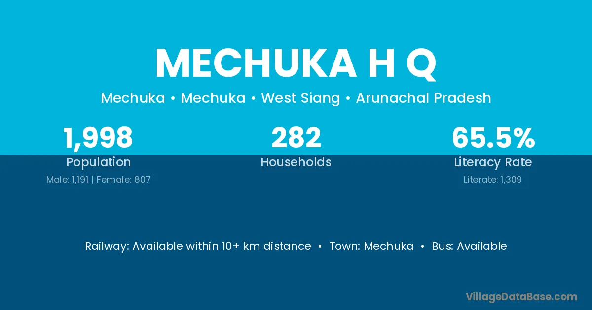 Mechuka H Q village has a total population of 1,998 people, of which 1,191 are males and 807 are females.