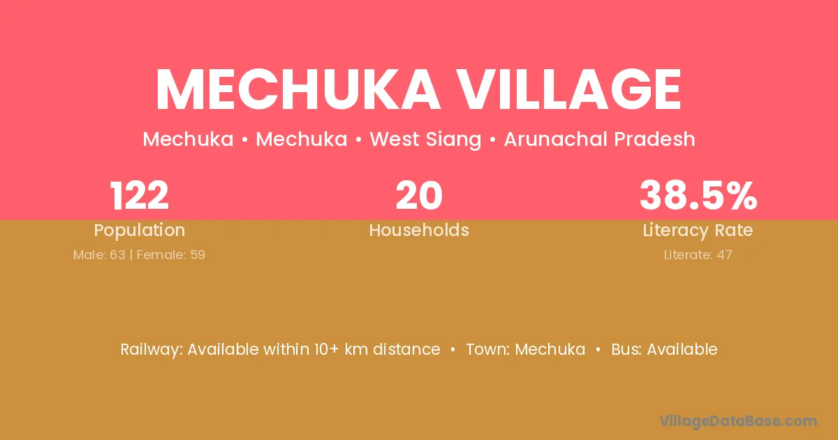 Mechuka Village village has a total population of 122 people, of which 63 are males and 59 are females.