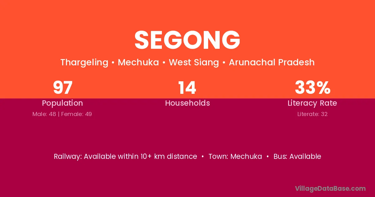 Segong village has a total population of 97 people, of which 48 are males and 49 are females.
