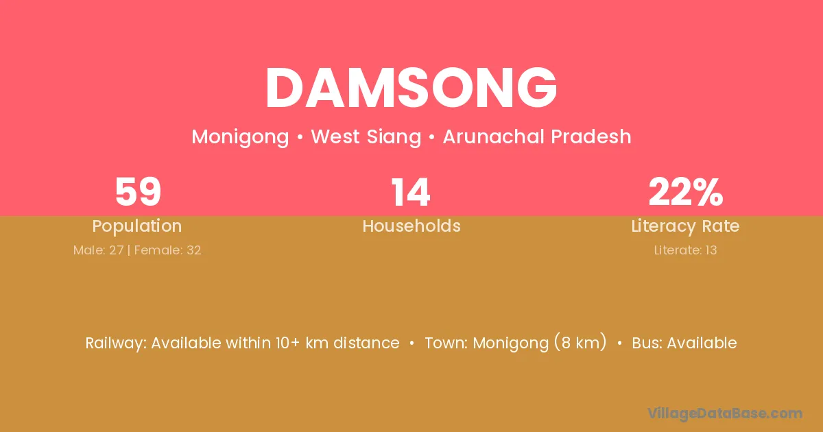 Monigong (8 km) is the nearest town to Damsong village for major economic activities and is located approximately 8 km away.