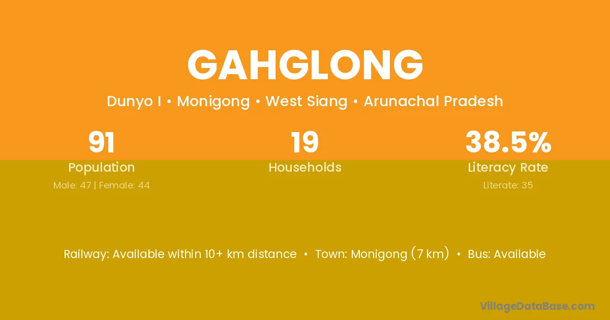 Monigong (7 km) is the nearest town to Gahglong village for major economic activities and is located approximately 7 km away.