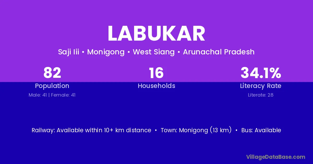 Labukar village has a total population of 82 people, of which 41 are males and 41 are females.