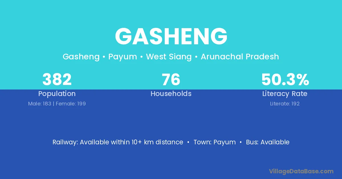 Gasheng village has a total population of 382 people, of which 183 are males and 199 are females.