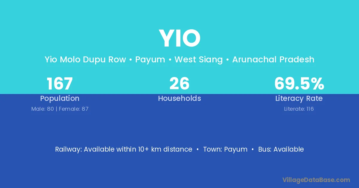 The literacy rate of Yio village is 69.46%. Male literacy stands at 72.50% and female literacy at 66.67%.