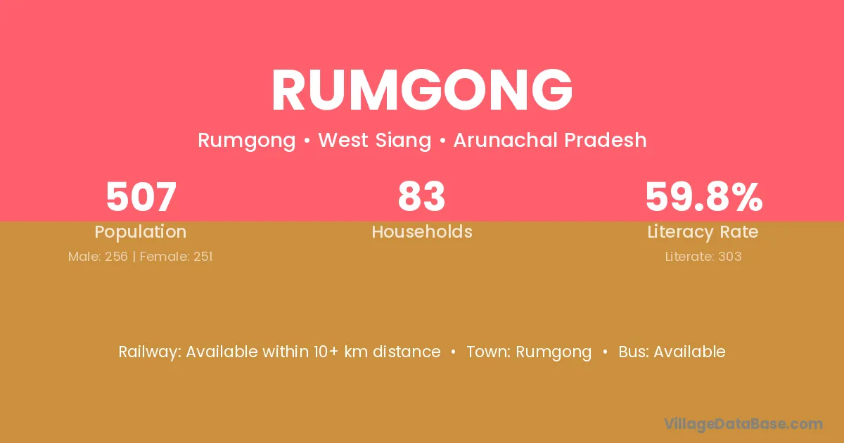 Rumgong village has a total population of 507 people, of which 256 are males and 251 are females.
