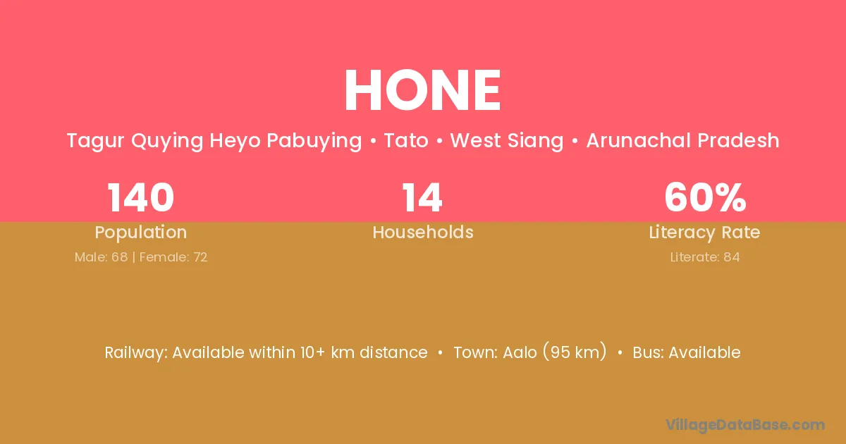 Aalo (95 km) is the nearest town to Hone village for major economic activities and is located approximately 95 km away.