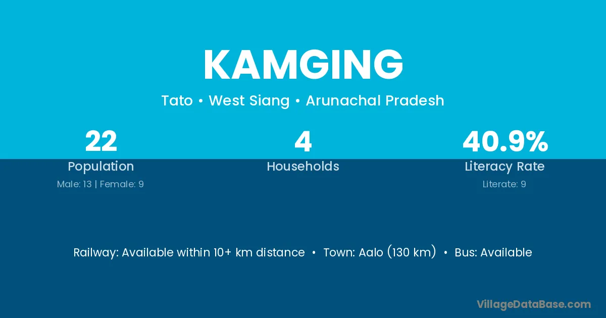 Aalo (130 km) is the nearest town to Kamging village for major economic activities and is located approximately 130 km away.