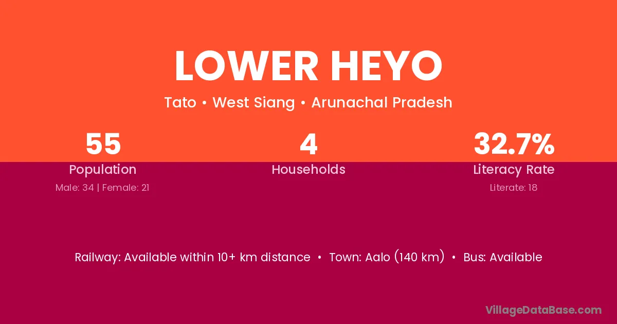 Lower Heyo village has a total population of 55 people, of which 34 are males and 21 are females.