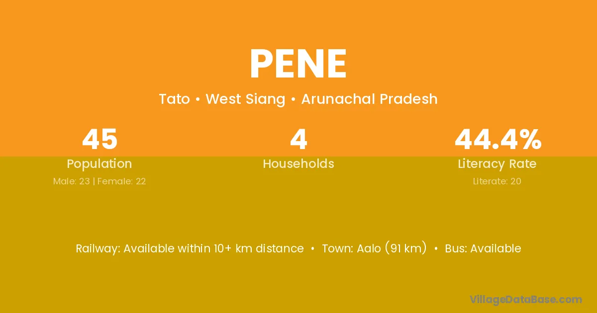 Aalo (91 km) is the nearest town to Pene village for major economic activities and is located approximately 91 km away.