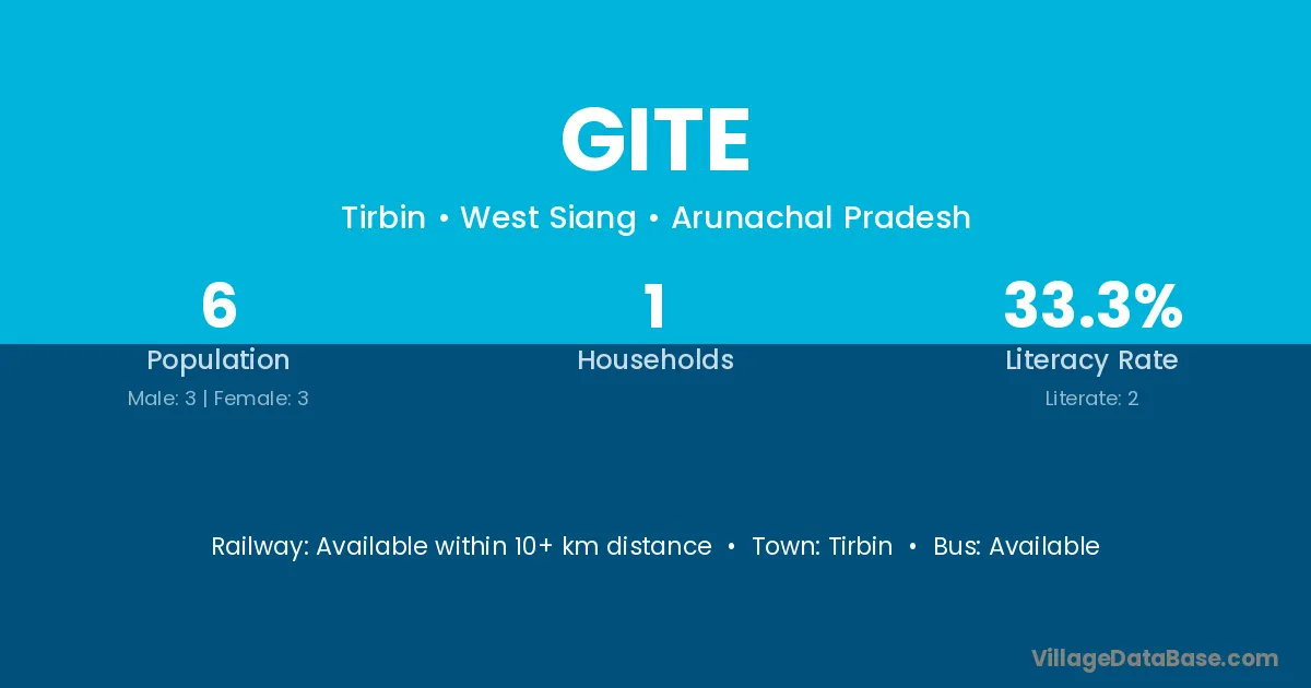 The literacy rate of Gite village is 33.33%. Male literacy stands at 33.33% and female literacy at 33.33%.
