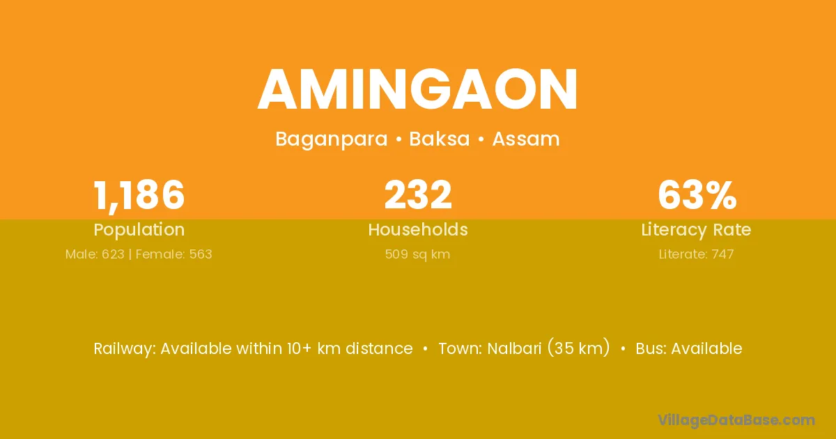 Amingaon village has a total population of 1,186 people, of which 623 are males and 563 are females.