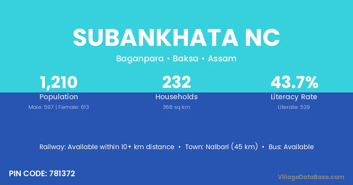 Nalbari (45 km) is the nearest town to Subankhata Nc village for major economic activities and is located approximately 45 km away.