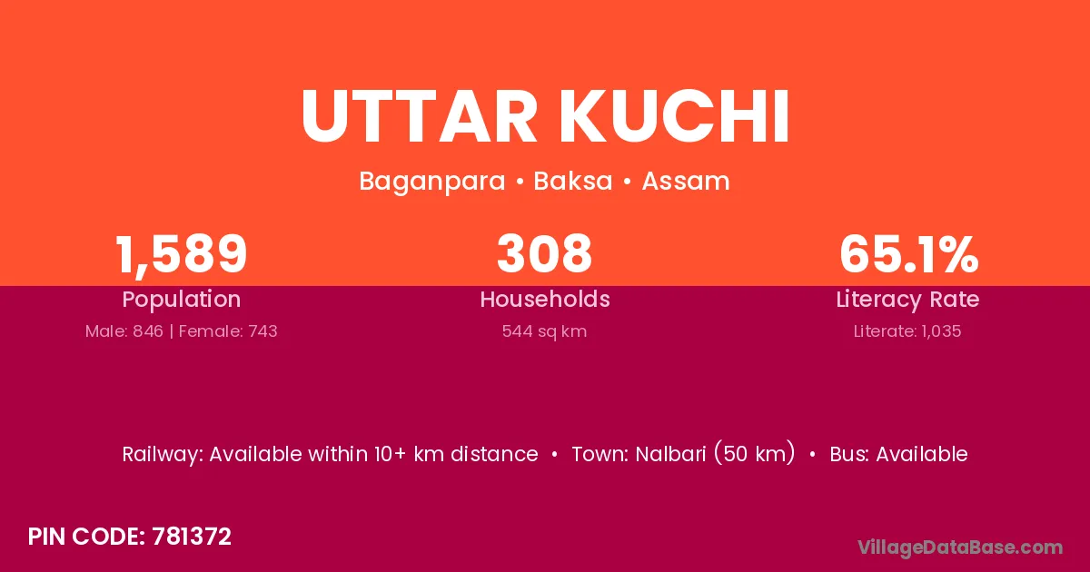 Nalbari (50 km) is the nearest town to Uttar Kuchi village for major economic activities and is located approximately 50 km away.