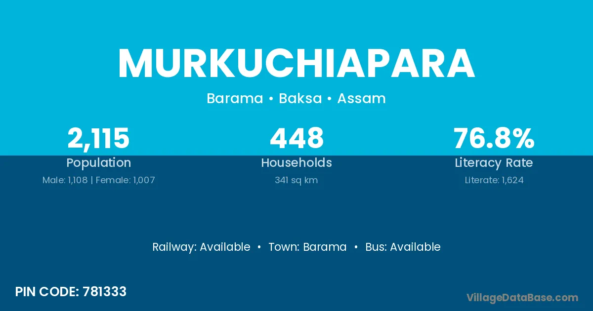 Murkuchiapara village has a total population of 2,115 people, of which 1,108 are males and 1,007 are females.