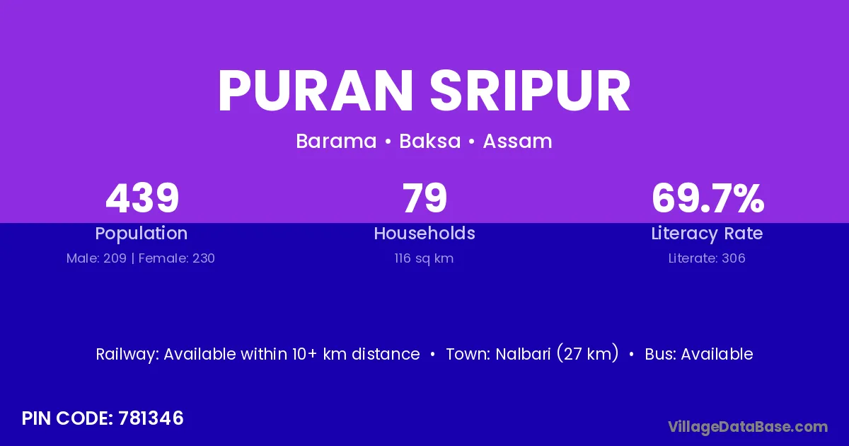 Nalbari (27 km) is the nearest town to Puran Sripur village for major economic activities and is located approximately 27 km away.