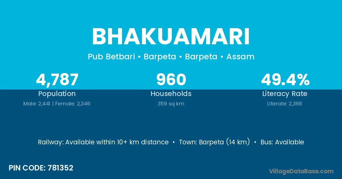 Barpeta Road (15 km) is the nearest town to Bhakuamari village for major economic activities and is located approximately 15 km away.
