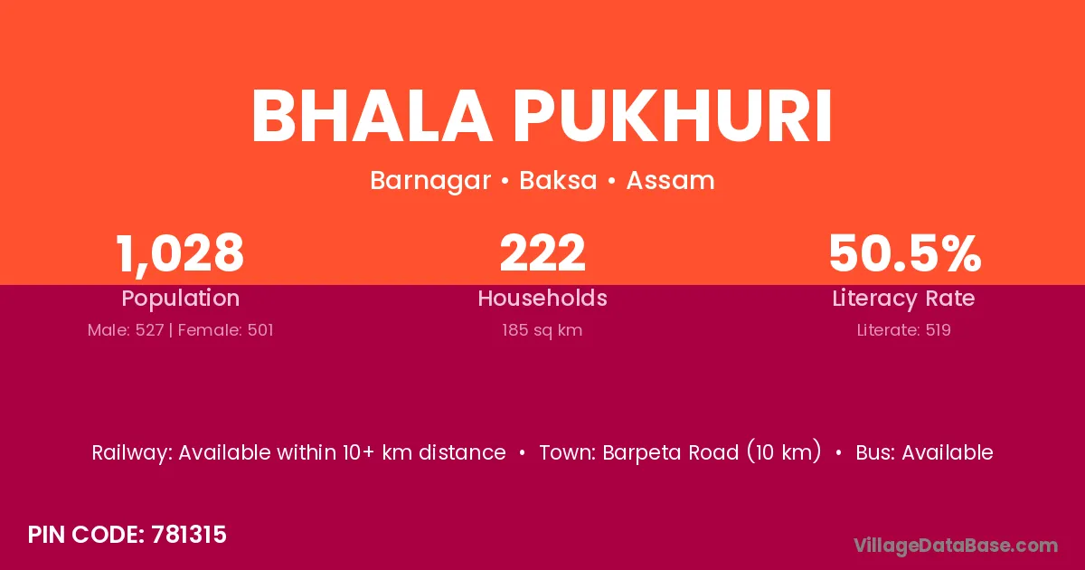 Barpeta Road (10 km) is the nearest town to Bhala Pukhuri village for major economic activities and is located approximately 10 km away.