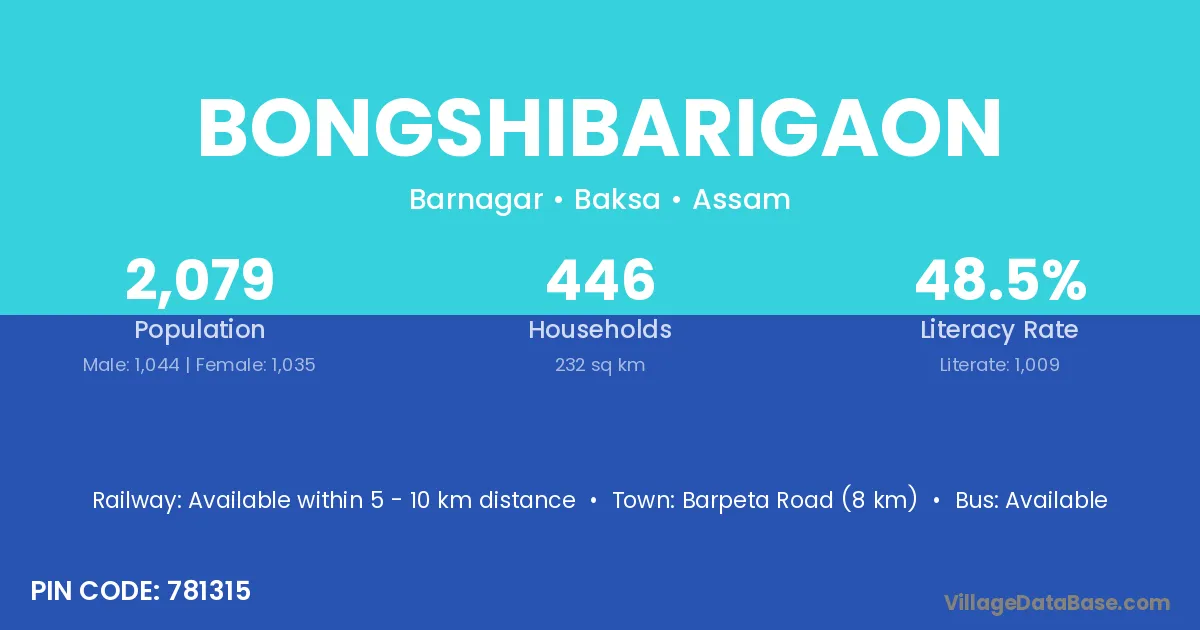 Barpeta Road (8 km) is the nearest town to Bongshibarigaon village for major economic activities and is located approximately 8 km away.