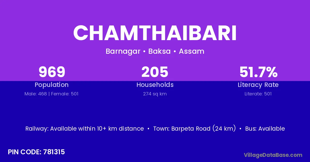 Barpeta Road (24 km) is the nearest town to Chamthaibari village for major economic activities and is located approximately 24 km away.