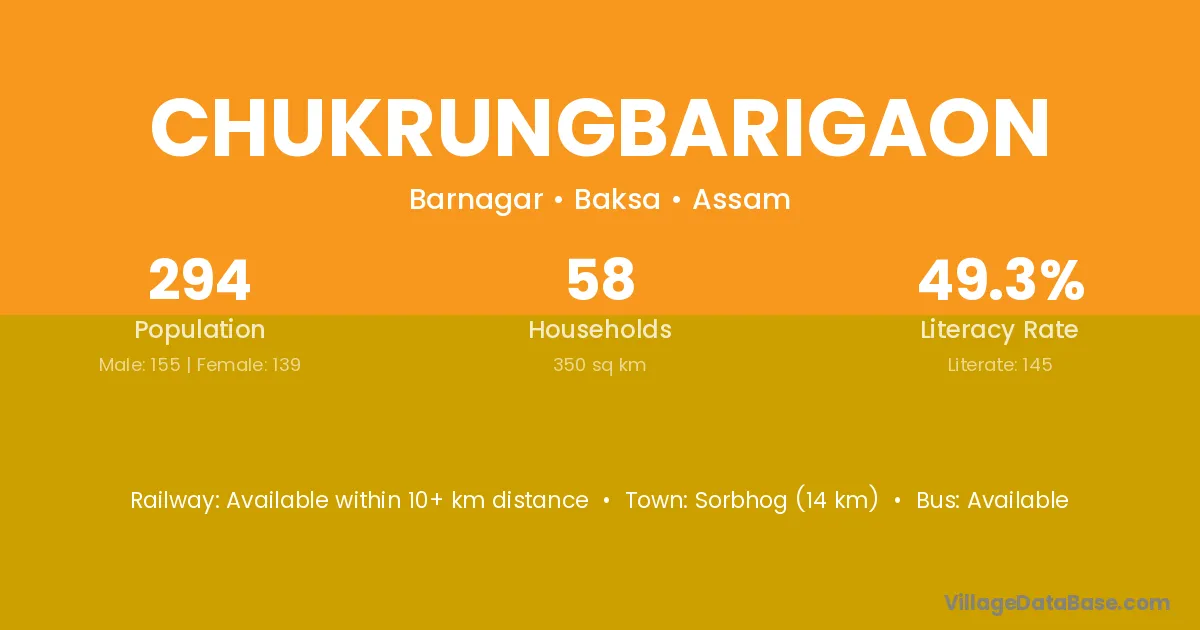 Sorbhog (14 km) is the nearest town to Chukrungbarigaon village for major economic activities and is located approximately 14 km away.