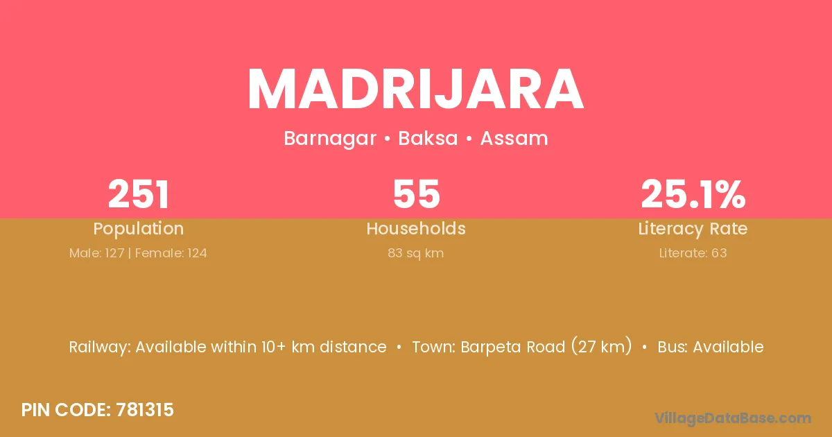 Barpeta Road (27 km) is the nearest town to Madrijara village for major economic activities and is located approximately 27 km away.