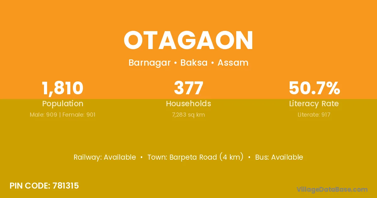Barpeta Road (4 km) is the nearest town to Otagaon village for major economic activities and is located approximately 4 km away.