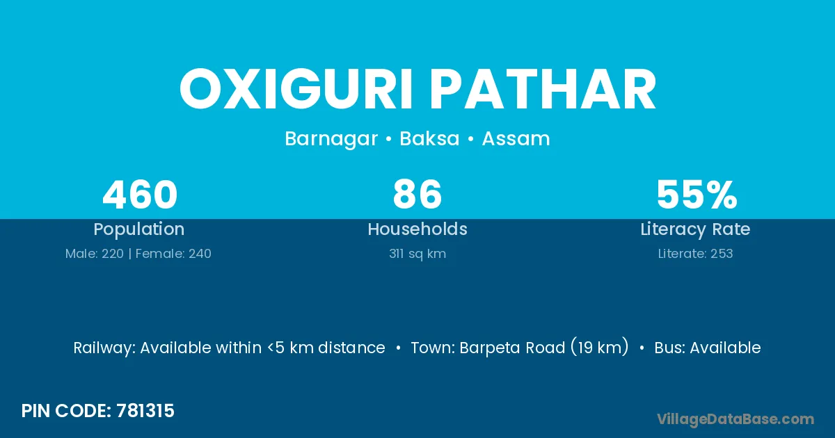 Barpeta Road (19 km) is the nearest town to Oxiguri Pathar village for major economic activities and is located approximately 19 km away.