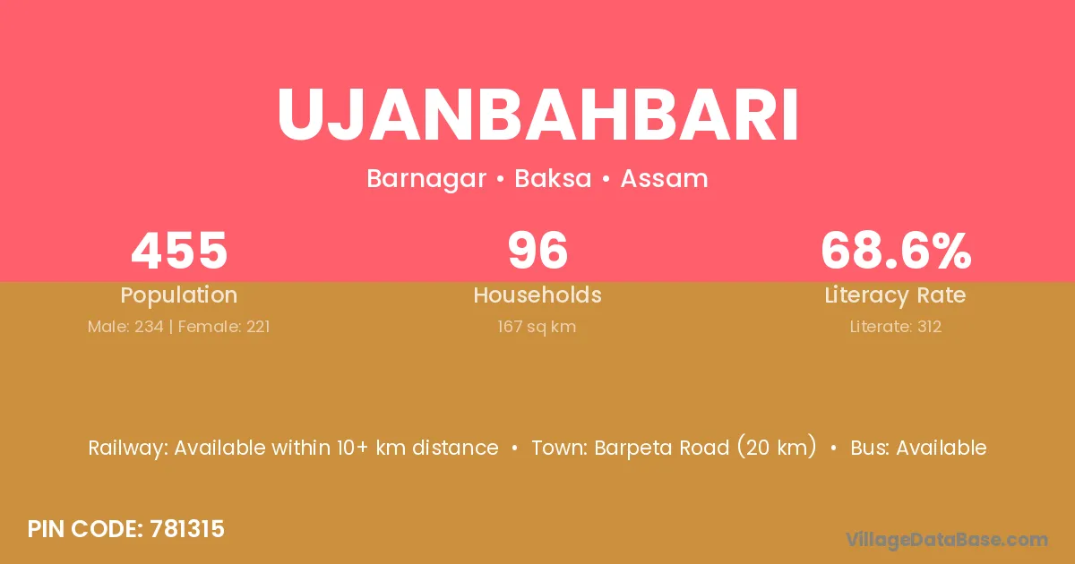 Barpeta Road (20 km) is the nearest town to Ujanbahbari village for major economic activities and is located approximately 20 km away.