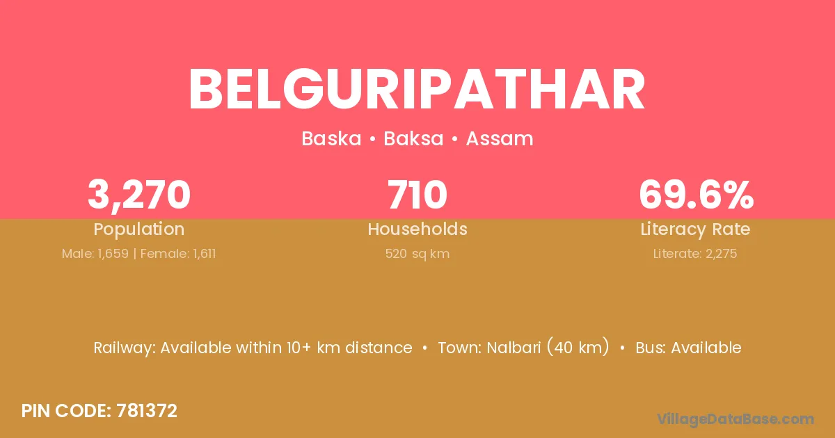 Nalbari (40 km) is the nearest town to Belguripathar village for major economic activities and is located approximately 40 km away.